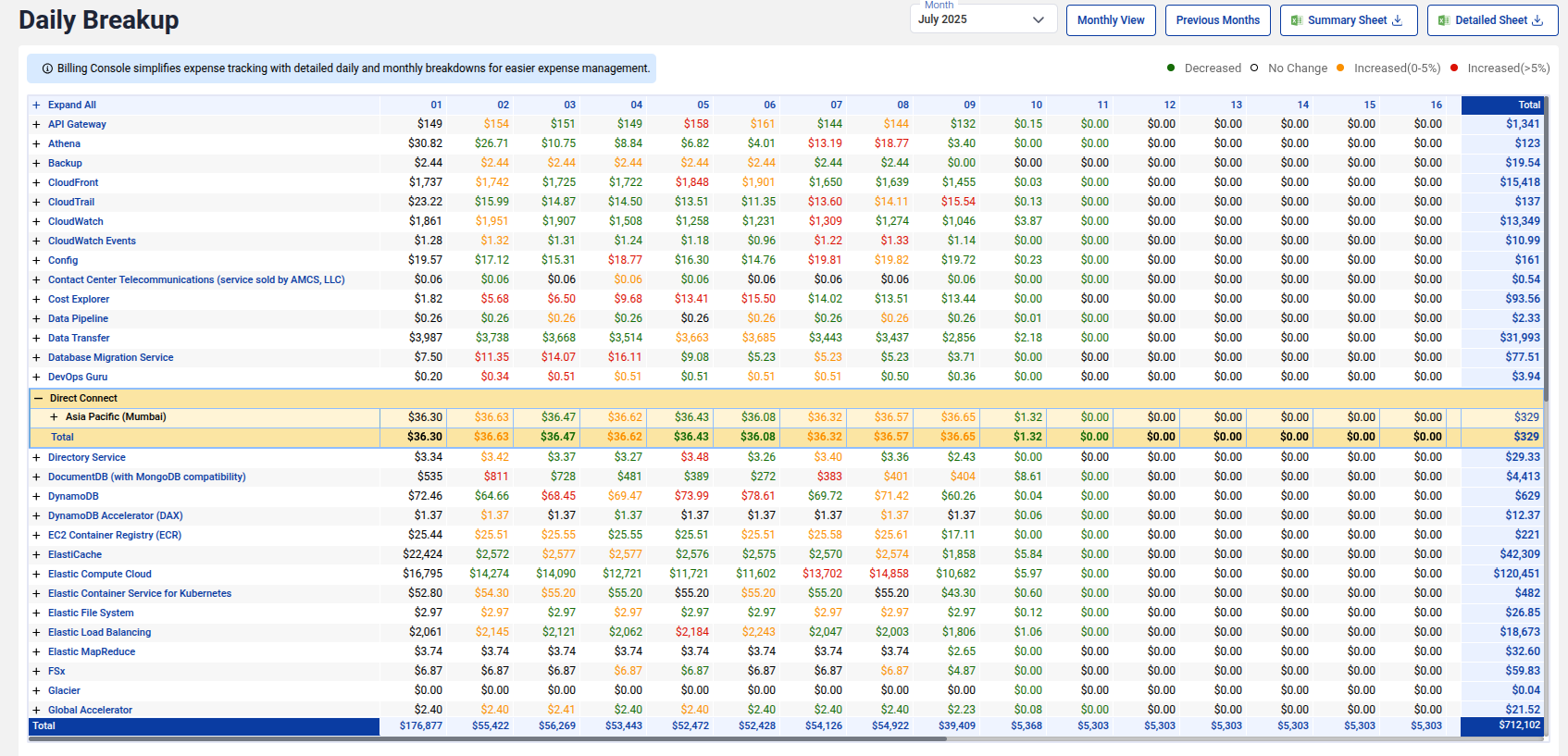 - Daily Cost Table: View total daily costs and compare spending across each day to spot anomalies or spikes.