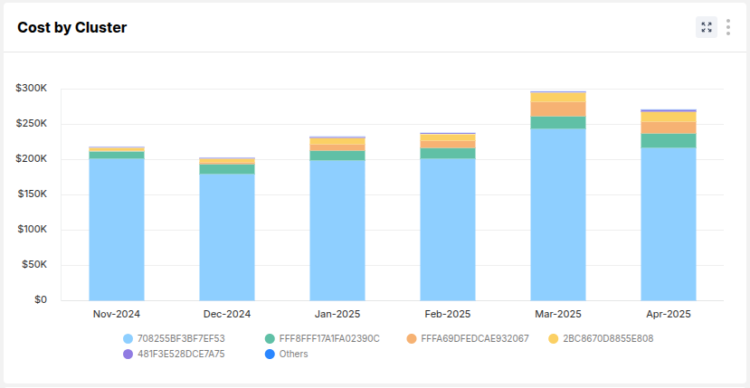 Displays a stacked bar chart showing month-on-month costs distributed across clusters. Helps you understand which clusters are contributing most to the spend.