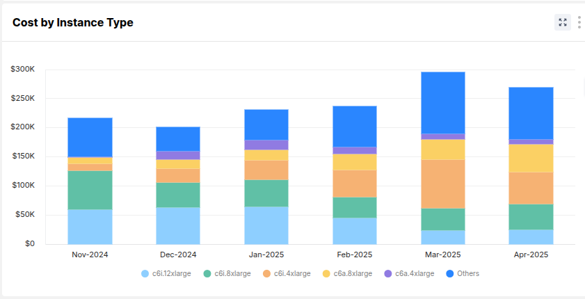 Displays how much each instance type (e.g., c6i.2xlarge, c6a.8xlarge) contributes to overall container costs. Helps with right-sizing and purchase strategy.