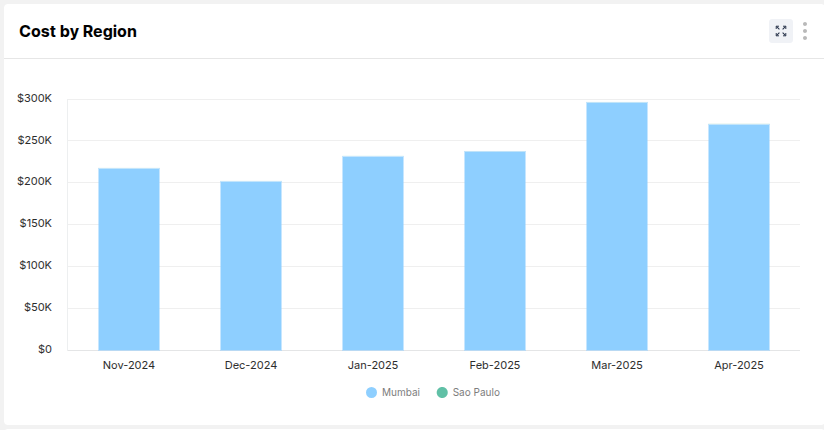 Shows container costs split by AWS regions (e.g., Mumbai, Sao Paulo). Useful for regional optimization and understanding global footprint.