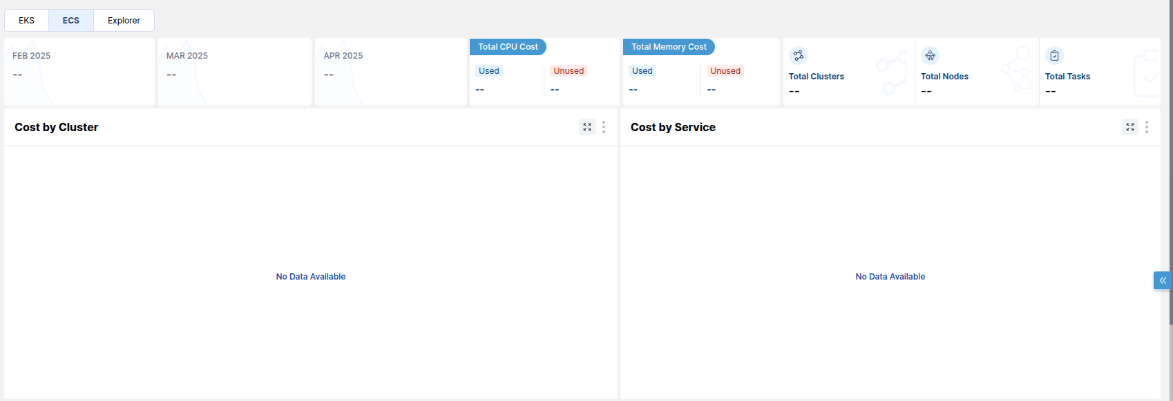 Similar cost breakdown is available for ECS clusters and tasks, though data may vary depending on your environment. When there is no ECS data, the graphs and metrics appear empty.