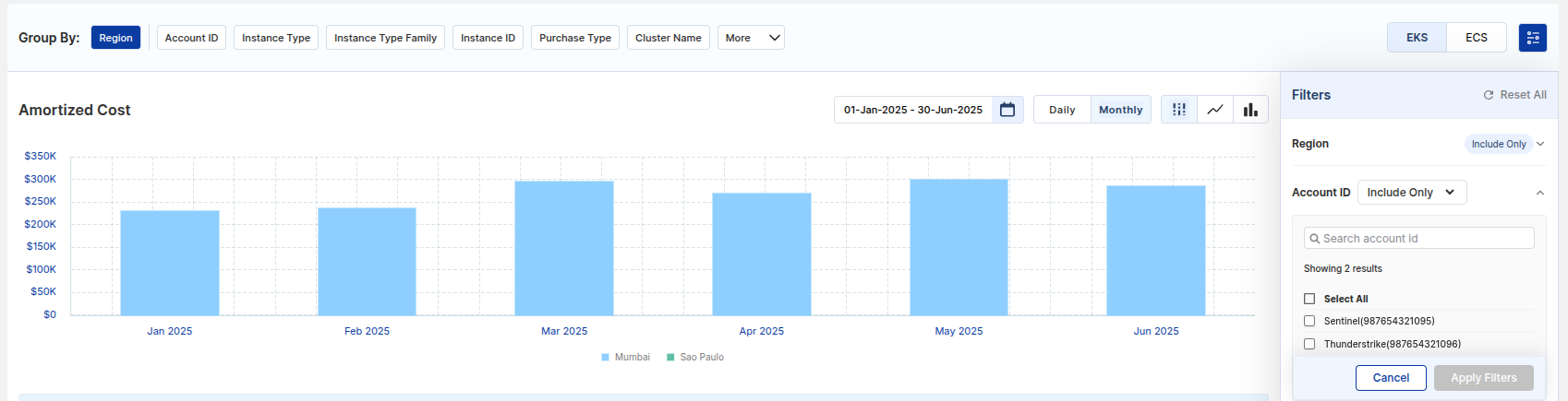 You can also use detailed filters on the right side to drill down into specific clusters, instance types, or other dimensions.