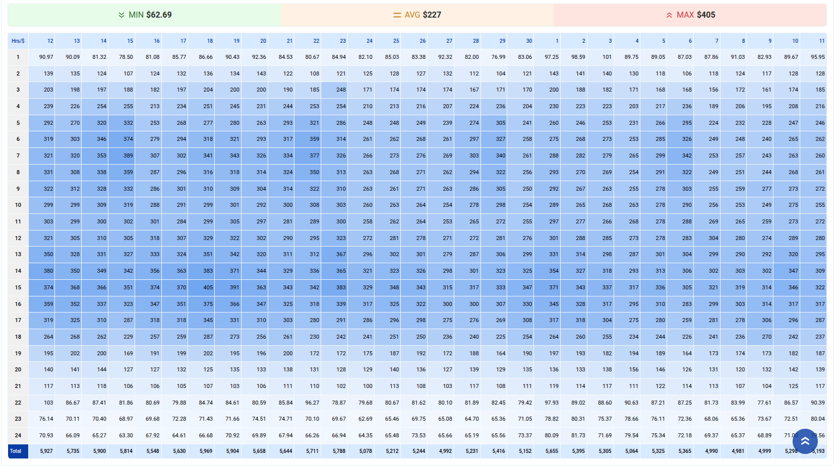 - Highlights peak transfer hours and low-cost periods.