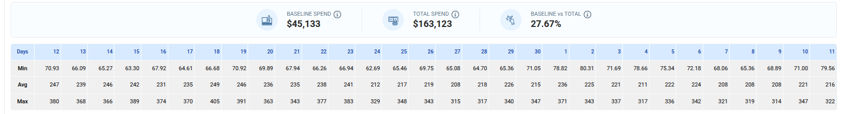 Baseline vs Total: Indicates the percentage of Total Spend represented by Baseline Spend, showing how much of your transfer cost is steady versus variable.