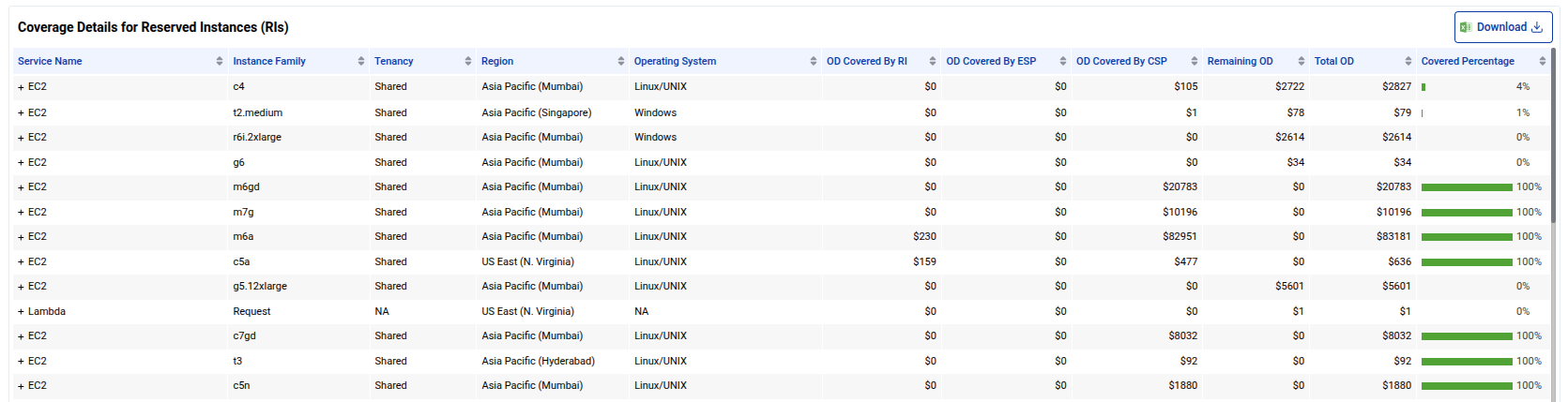 Coverage Details for Reserved Instances (RIs)