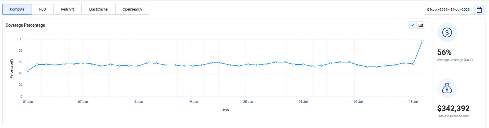 - Coverage Percentage: This metric shows the percentage of your On-Demand costs (in dollars) that are covered by reservations.