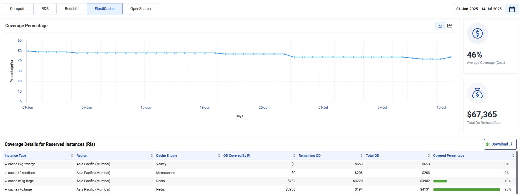 You can track the coverage for services like ElastiCache, ensuring that your services are adequately covered by RIs and helping reduce On-Demand costs.