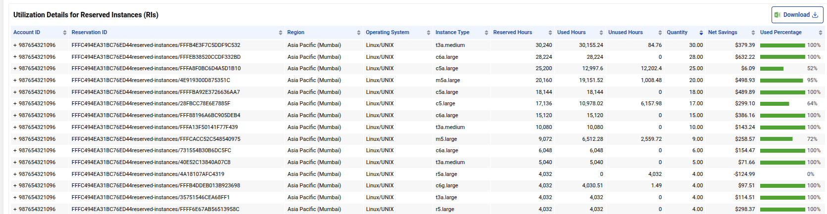 This section shows the detailed breakdown of how Reserved Instances are being utilized across different services, regions, and instance families. It helps you identify the areas where you're getting the best value from your RIs and where adjustments might be needed.