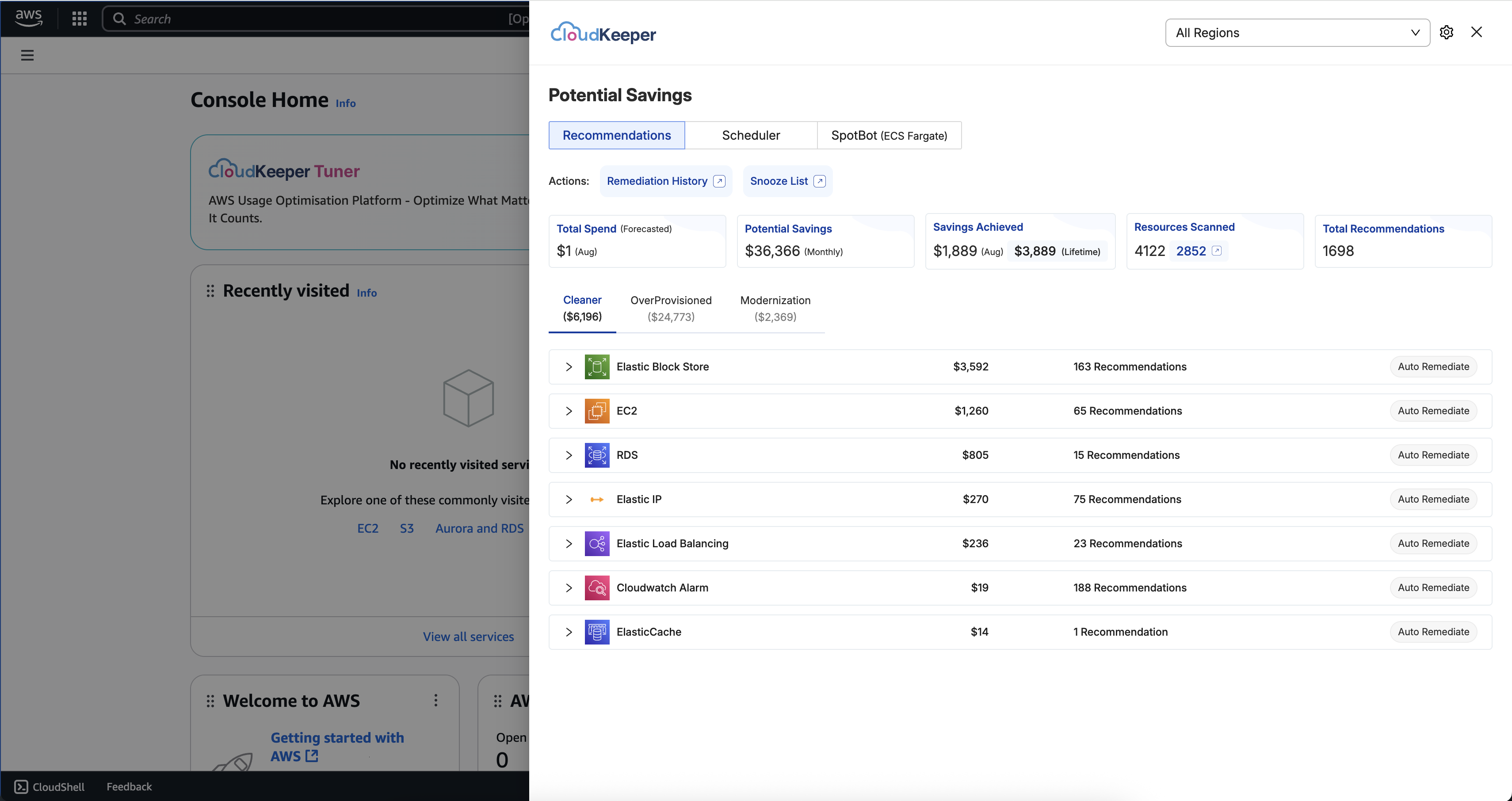 - Quick access to the full Tuner platform: A single click on the extension banner expands the full Tuner dashboard within the AWS console, giving you access to Cleaner, Over-Provisioned, and Modernization recommendations without changing tabs.