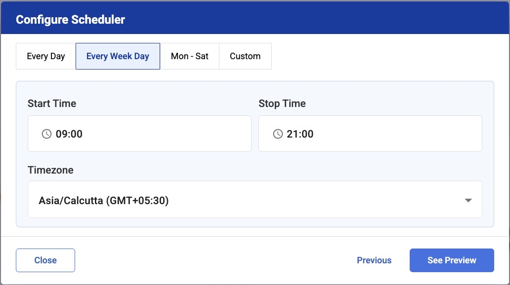 Specify when you want the scheduler to run using recurrence expressions such as daily, weekly, or specific weekdays, with chosen start/stop times and time zone.
